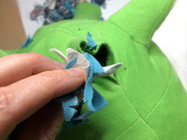 Wenn du möchtest, kannst du nun schon mal anfangen, die Spitze des Tentakels zu stopfen. Dazu kannst du Füllwatte verwenden oder kleingeschnittene Stoffreste wie hier: