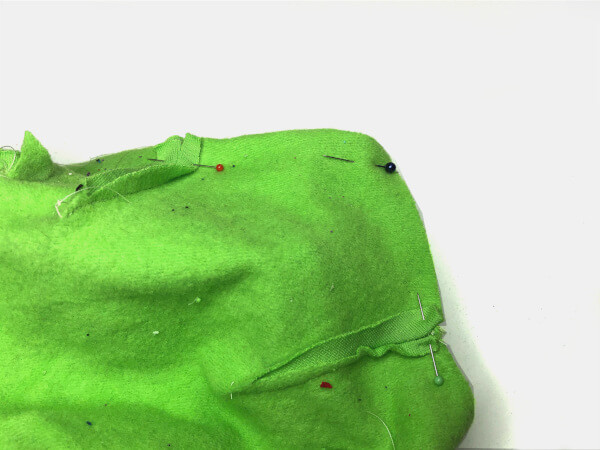 Jetzt wird die Kappe angenäht. Dazu legst du eine abgerundete Ecke rechts-auf-rechts (schöne Seiten zusammen) auf den Beginn des Tentakels.
