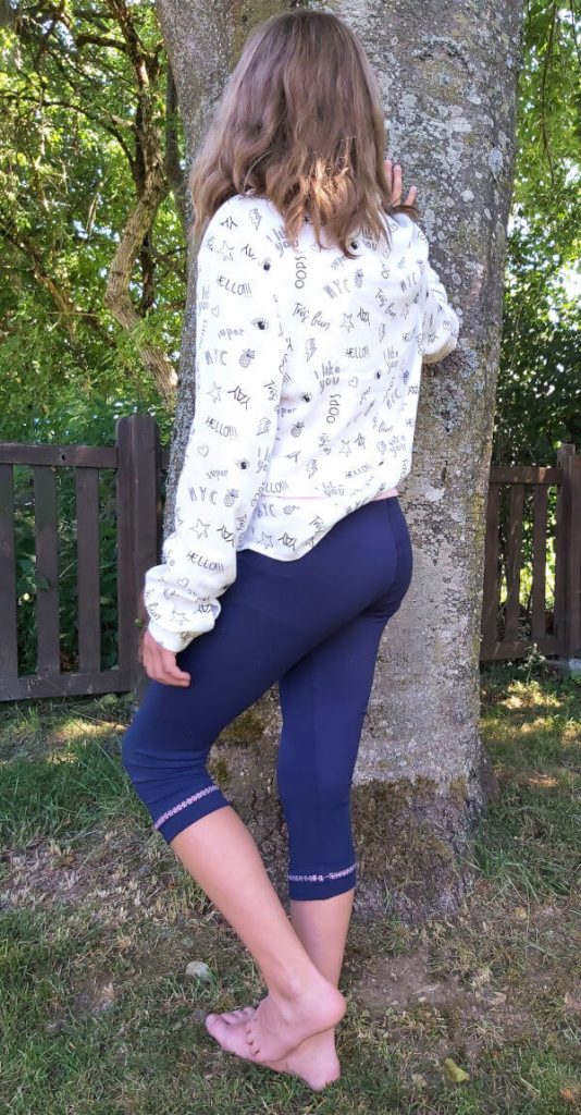 Die Leggins Luna für Mädchen in 146 – 170 hat eine Teilungslinie, die dir zeigt, an welcher Länge du kürzen kannst, um eine Caprileggings zu erhalten. Die Bilder beweisen, dass diese Hose für eine Sommer-Garderobe einfach unverzichtbar sind. 🙂